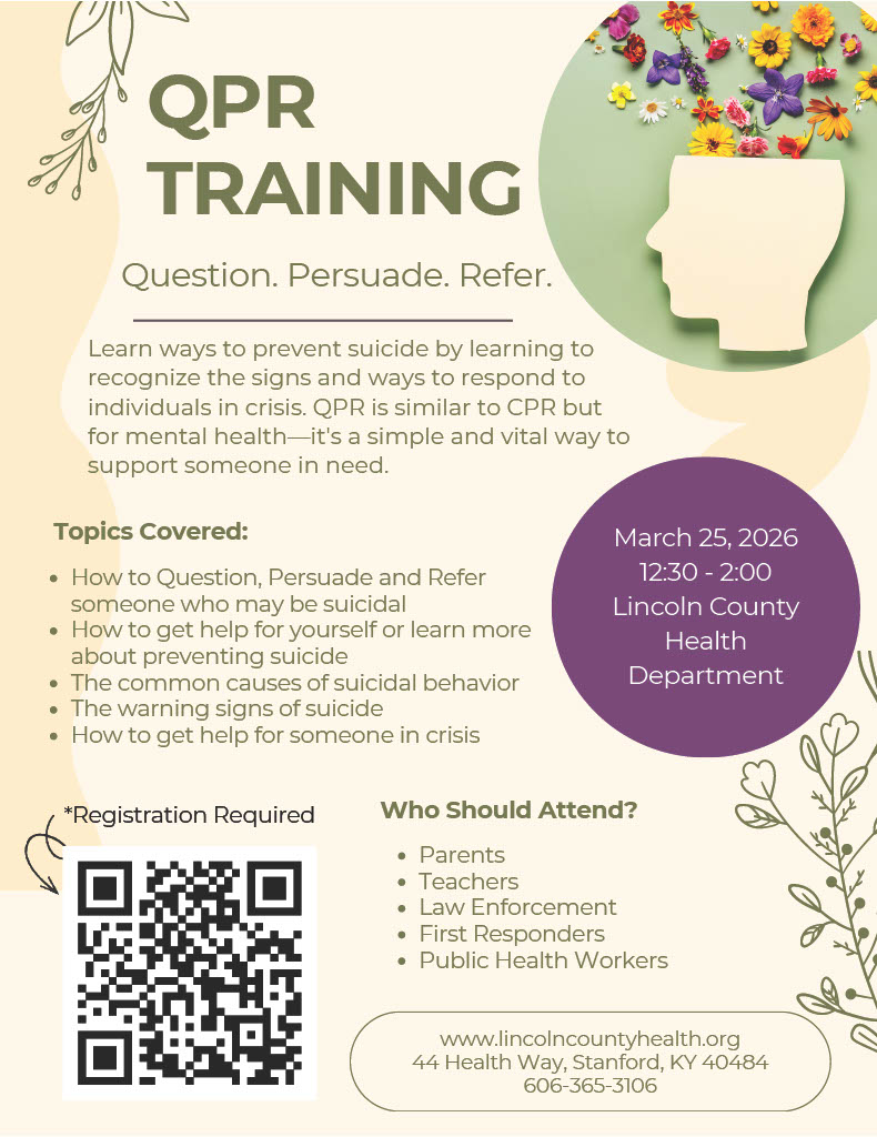 The Lincoln County Health Department is offering QPR Training (Question. Persuade. Refer.), an important mental health education course designed to help individuals recognize the warning signs of suicide and respond effectively when someone may be in crisis.